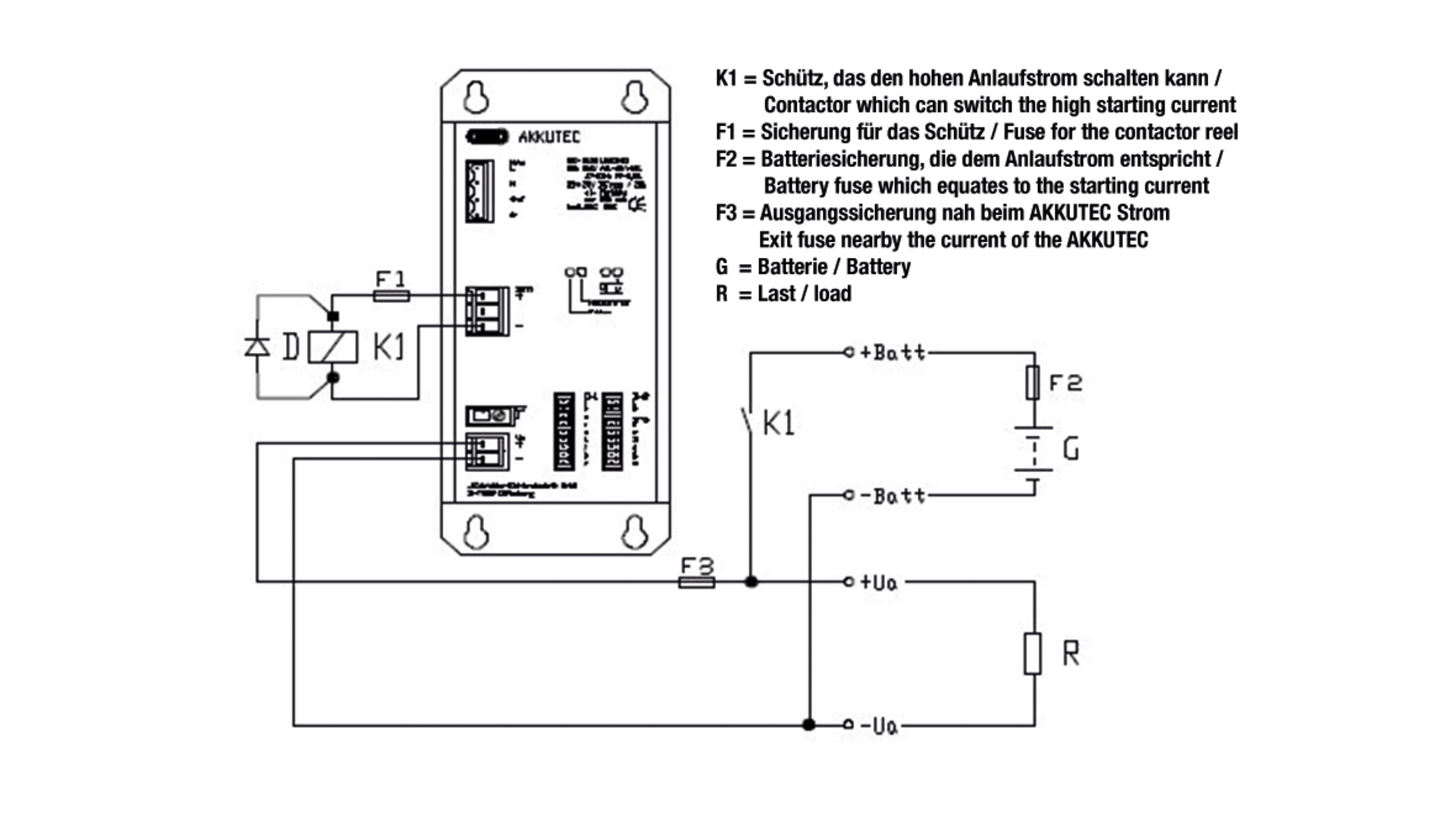 Arbeitet die gepufferte Last mit hohen Anlaufströmen, so kann dies zu einer Überlastung der Stromversorgung sowie des Tiefentladerelais führen.Um dies zu vermeiden, wird eine Batterie am Ausgang des AKKUTECs angeschlossen.
