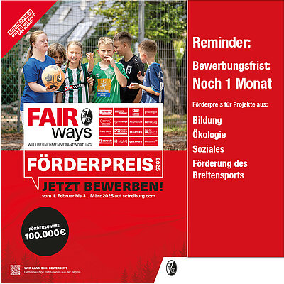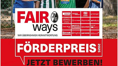 Seit dieser Woche läuft die Bewerbungsphase für den FAIR ways Förderpreis. Bis zum 31 März können sich gemeinnützige Organisationen aus Südbaden mit ihren Projekten für eine Fördersumme bewerben. Auf der Webseite des SC Freiburg ist das Formular für die Bewerbung hinterlegt, mit dem sich Interessierte schnell und unbürokratisch bewerben können