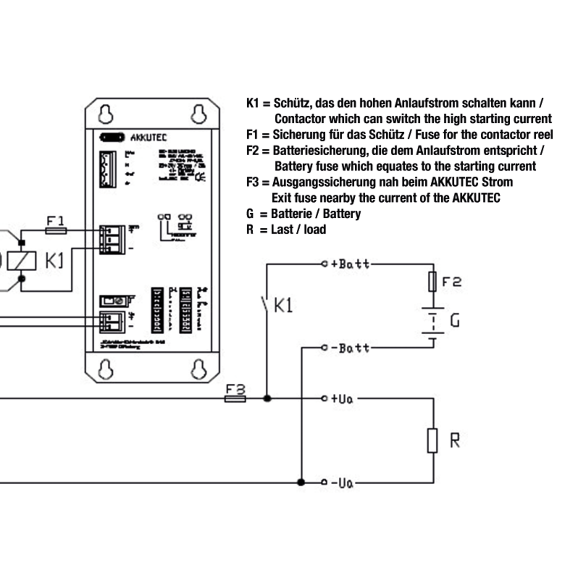 An overload of the internal trace pitch and the deep discharge relay will be avoided, when a battery is connected at the output of the AKKUTEC.The current will be shared hereby between the AKKUTEC and the Battery.